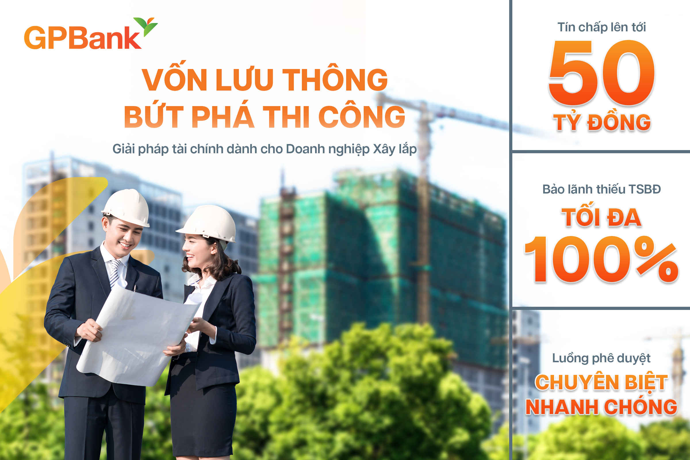 Thấu hiểu tính cấp bách của các công trình, GPBank xây dựng luồng thẩm định và phê duyệt chuyên biệt cùng cơ chế đánh giá linh hoạt giúp rút ngắn tối đa thời gian xử lý hồ sơ, đáp ứng nhanh chóng nhu cầu vốn để doanh nghiệp an tâm tập trung vào năng lực thi công cốt lõi.